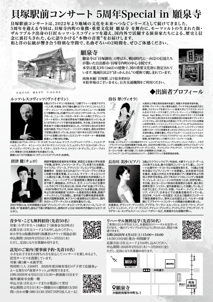 オーストリアから国際的ヴァイオリニストのルッツ・レスコヴィッツ氏を迎えて、重要文化財の貝塚御坊願泉寺本堂で、本格クラシックのコンサートを開催します。